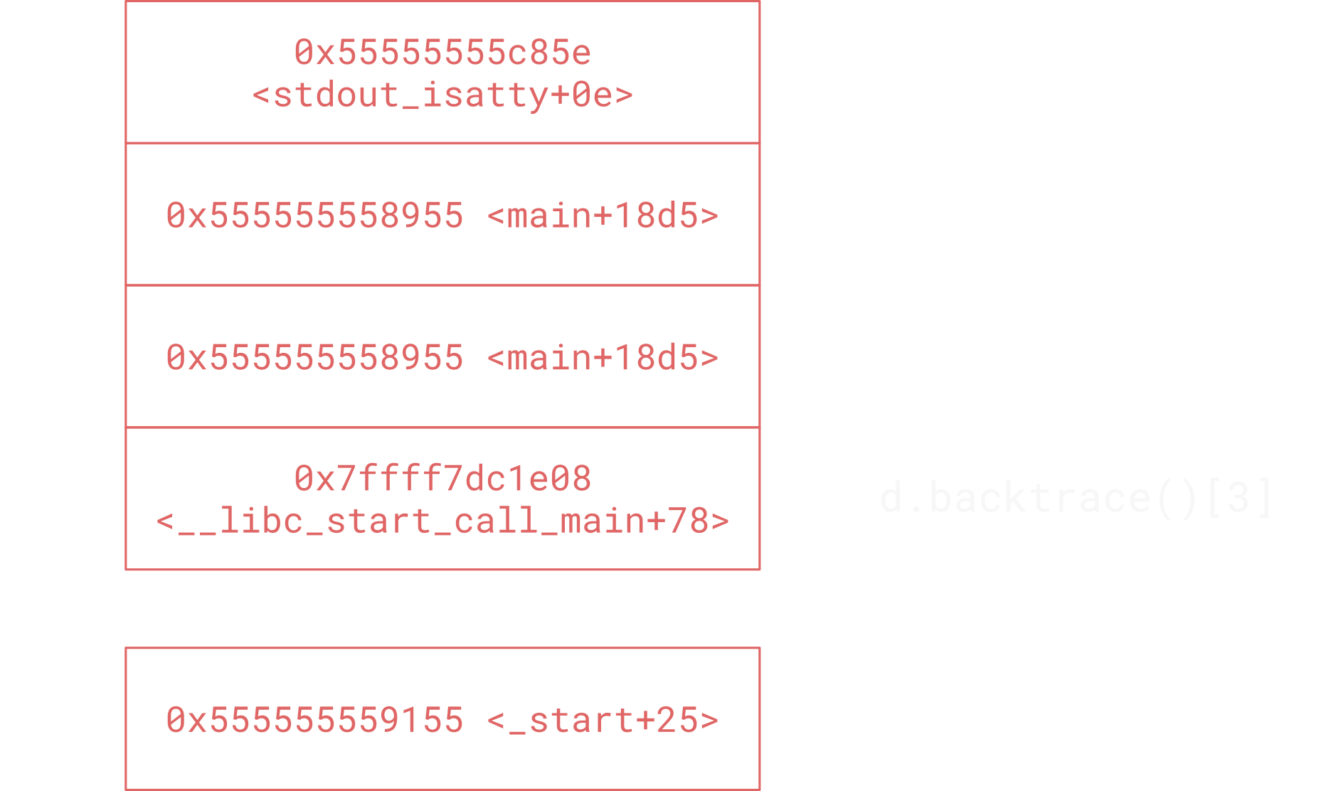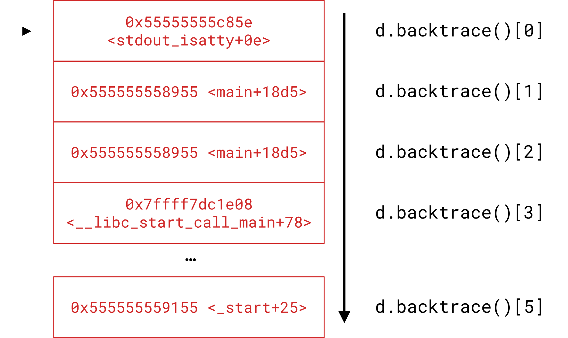 libdebug's backtrace is structured like a LIFO stack, with the top-most value being the current instruction pointer. Subsequent values are the return addresses of the functions that were called to reach the current instruction pointer.